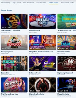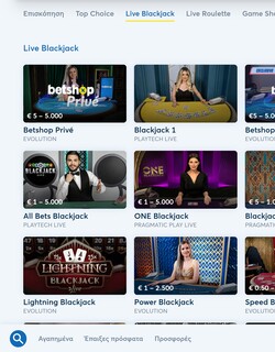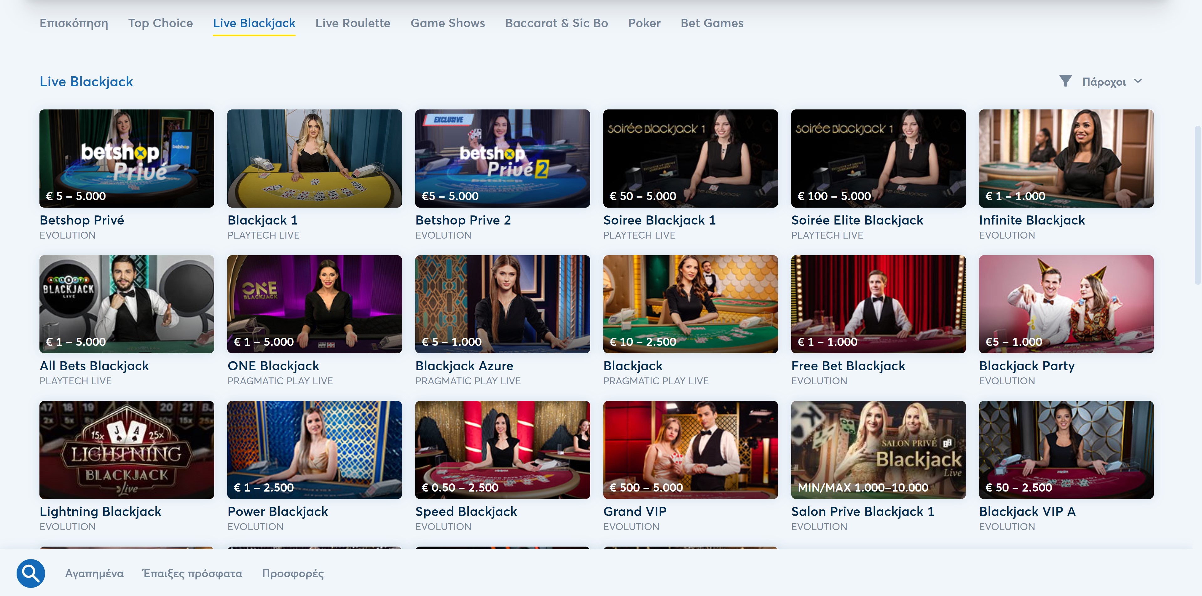Το Live Casino της Betshop αποτελεί μία εξαιρετική επιλογή, καθώς διαθέτει ένα ρόστερ με τέσσερις μεγάλους live παρόχους: Playtech, Evolution, Pragmatic και BetGames. Η αλληλεπίδραση με Έλληνες και ξένους dealers σε πραγματικό χρόνο κάνει το παιχνίδι πιο ρεαλιστικό από ποτέ, δίνοντας στους παίκτες την αίσθηση της φυσικής παρουσίας στο live καζίνο.