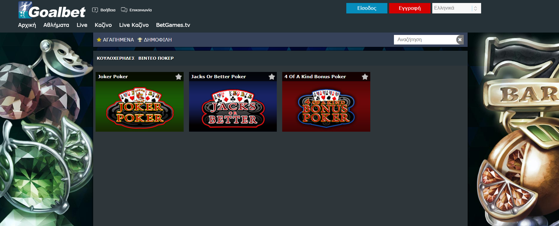 Η Goalbet προσφέρει σοβαρές επιλογές και σε όσους προτιμούν περισσότερο τα table games. Το Video Poker (Joker Poker, Jacks or Better και 4 of a Kind Bonus poker) έχει την τιμητική του, με τον χρήστη πάντως να μπορεί να δοκιμάσει την τύχη του και σε άλλα κλασικά παιχνίδια μέσω της υπηρεσίας BetGames.tv.