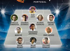 Ο Άγγελος Χαριστέας ήταν ο μεγάλος πρωταγωνιστής της Ελλάδας, ωστόσο δεν συμπεριλήφθηκε στην κορυφαία ενδεκάδα! Αντίθετα, η UEFA επέλεξε τον Μίλαν Μπάρος, πρώτο σκόρερ του τουρνουά με 5 γκολ. Δεύτερος της λίστας ο 19χρονος Κριστιάνο Ρονάλντο, ο οποίος ξέσπασε σε κλάματα μετά το χαμένο τελικό. Η συνέχεια της καριέρας του δεν είχε χώρο για δάκρια. Την τριάδα της επίθεσης συμπληρώνει ο 19χρονος Γουέϊν Ρούνεϊ, συμπαίκτης του Κριστιάνο Ρονάλντο στην κοινή τους θητεία στην Μάντσεστερ Γιουνάιτεντ. Ο 18χρονος επιθετικός πέτυχε 4 γκολ στο τουρνουά και ένα νέο αστέρι άρχισε να ανατέλλει…